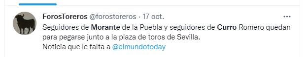 En tuiter quedan para ofenderse, para insultarse casi tanto como los futboleros medios. Más respeto para los toreros. Si los elogios a Morante te parecen excesivos, te puede ir silvando, pero no insultando a la afición.