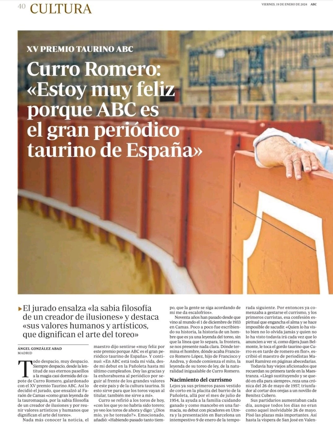 Curro Romero gana el premio taurino abc: Gran leyenda de la tauromaquia, y por reunir valores artísticos y humanos que dignifican el arte del toreo