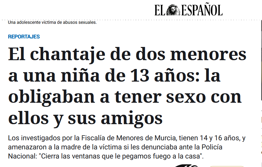 El chantaje de dos menores a una niña de 13 años: la obligaban a tener sexo con ellos y sus amigos. Tienen entre 14 y 16 años. También amenazaban a la madre de la víctima. https://www.elespanol.com/reportajes/20 ... 007_0.html