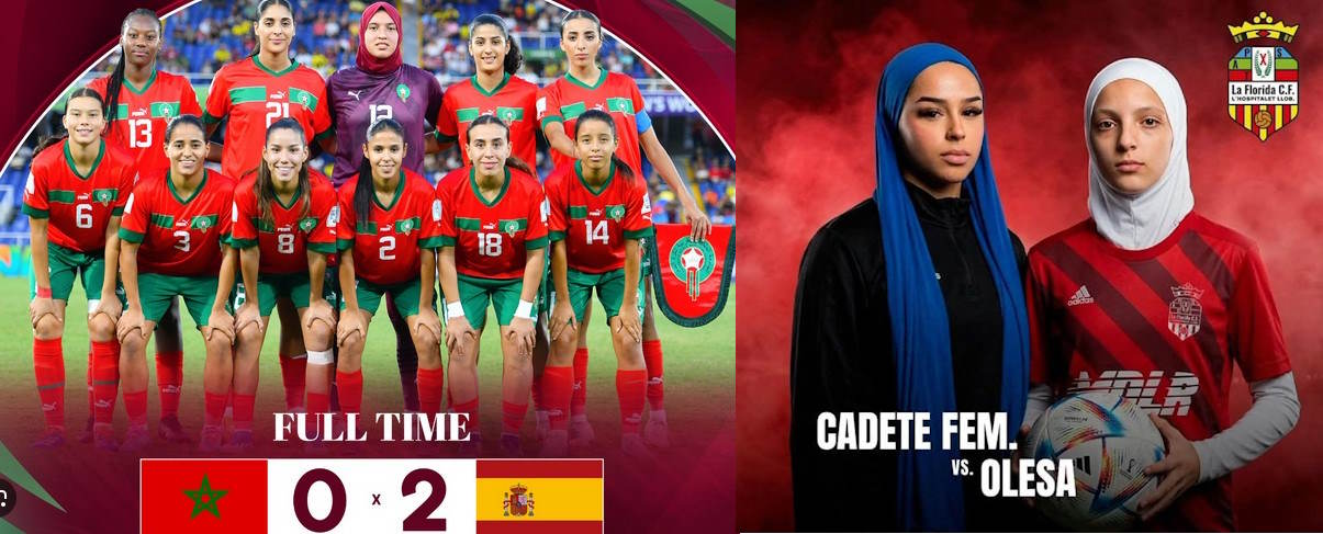 Dos fotografías que hablan por sí mismas. la selección femenina de fútbol de Marruecos. Solo una jugadora soporta la imposición de llevar cubierto el pelo (obligatorio entre integristas religiosos cuando a una mujer la ven personas que no son familia directa). Hospitalet de Llobregat, las mujeres musulmanas obligadas a vestir según las corrientes religiosas integristas.
