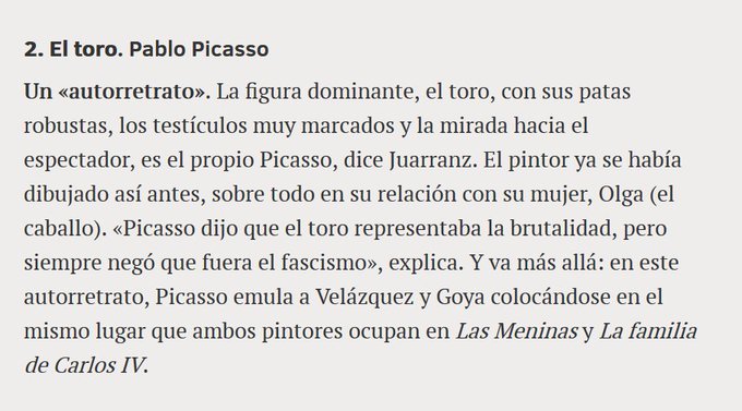 Medio siglo sin Picasso: guía para adentrarse en su vida y obra es el reportaje de El País sobre todo lo relacionado con Picasso en España en este medio siglo desde la muerte del genio andaluz. Pues bien, El País solo habla de toros remitiéndose a la corrida de toros picassiana de Málaga y la decoración del ruedo. A todas luces no solo insuficiente, sino una injusticia flagrante