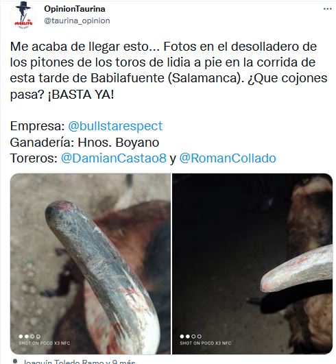 Esto es un fraude, mutilar a un toro, dejar al animal sin defensas es un fraude a los aficionados y a la fiesta, aquí os pongo este tuit de Opinión Taurina, porque esto es un delito y hay instancias en la tauromaquia para parar esto.