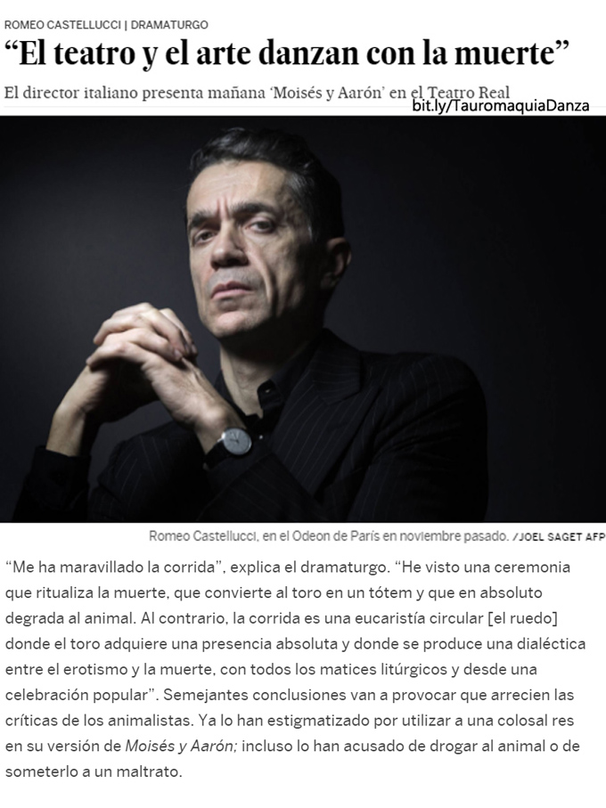 Me ha maravillado la corrida. He visto una ceremonia que ritualiza la muerte, que convierte al toro en un tótem y que en absoluto degrada al animal. Así habla Romeo Castellucci que acaba de triunfar en Valencia