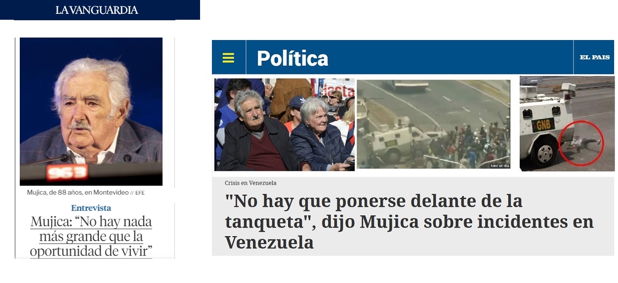 Aquí va un ejemplo con el ex presidente de Uruguay Pepe Mújica. Este sujeto, fungiendo como presidente, aplaudió los atropellos, literales, de las tanquetas venezolanas lanzadas contra manifestantes pacíficios. Ahí están las fotos. Hoy, el periódico del conde, como se ha mencionado aquí en forostoreros, saca una entrevista de este mismo personajes siniestros de la izquierda latinoamericana. Pep Mújica. Sí, el que aconsejaba a la gente no ponerse delante de las tanquetas.