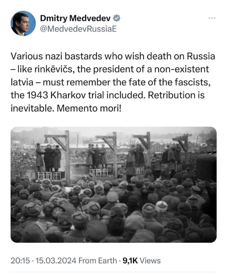 Medveded, el que fue presidente ruso, ha lanzado una abierta amenaza contra el gobierno de Letonia, con una foto de ejecuciones por horca en tiempos soviéticos. Medveded pretende refrescar la memoria sobre el tratamiento de Rusia a los que llama "nazis" o "fascistas". Putin va hasta el final. Y Medveded, su escudero, lo confirma así:
