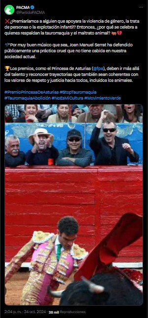 «¿Premiaríamos a alguien que apoyara la violencia de género, la trata de personas o la explotación infantil?» Es la réplica de los animalistas de PACMA para criticar el otorgar el premio Princesa de Asturias a Serrat.
