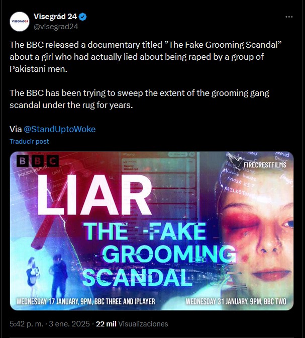 ¿Habéis oído hablar de Rotherham, en Gran Bretaña? Seguro que sí. Un caso de violaciones en manadas de hombres contra niñas de hasta once años. El caso fue "tapado" por los medios. Pero Elon Musk, precisamente en año nuevo, ha "repostedado" y de momento, lleva casi 30 millones de visualizaciones. Es muy probable que el fondo del asunto, el caso Rotherham, vuelva a los medios, con lo que el escándalo se multiplicará.