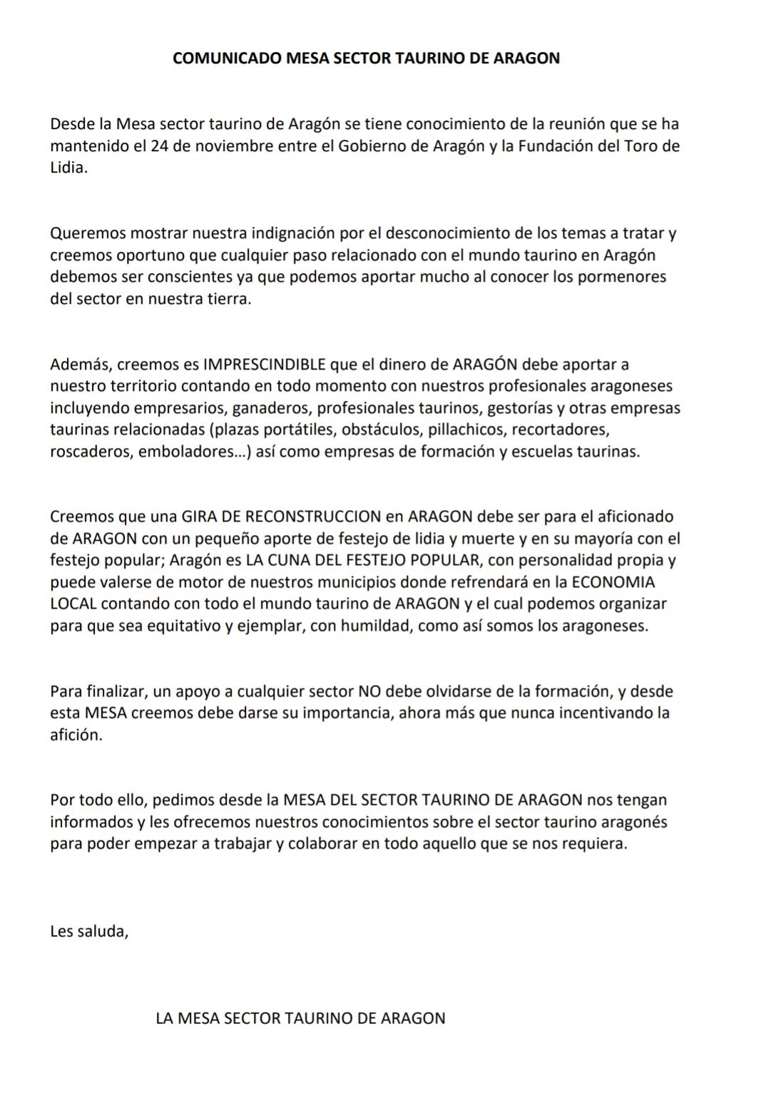 Una polémica más por la actuación de la Fundación del Toro de Lidia. En este caso, desde Aragón recriminan a la Fundación no hacer partícipes a los aragoneses de sus reuniones con el Gobierno de Aragón, y lo hacen con un comunicado, este: