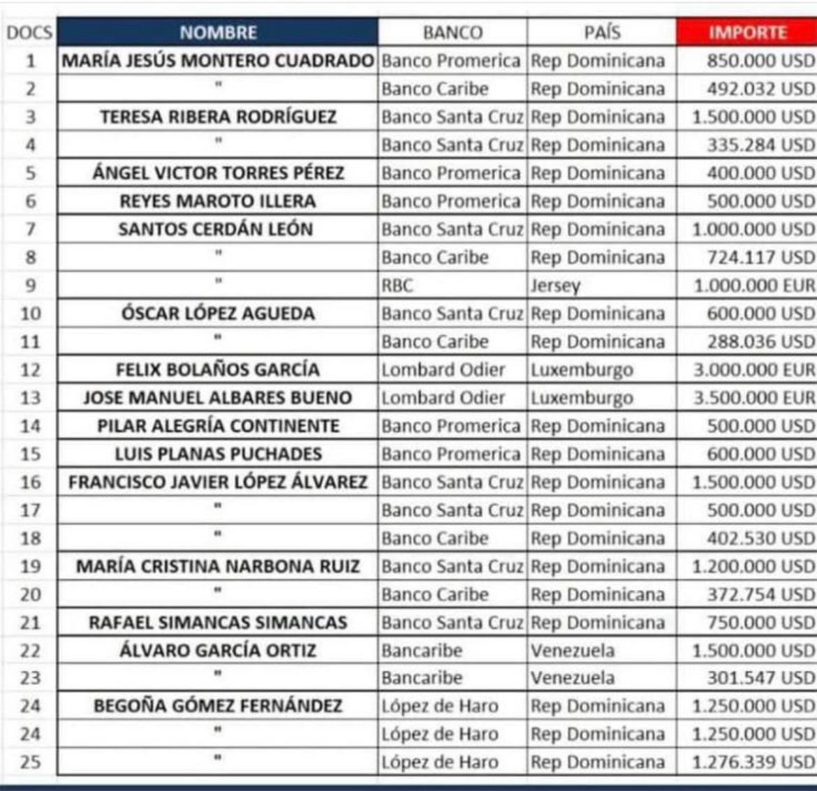 Esto está circulando por internet en estos días, además de notas de cuentas relacionadas con sindicatos y agrupaciones de policías, que informan de las investigaciones de la UCO que han llevado a detectar más de 1.000 millones de euros en cuentas opacas de políticos españoles de izquierda. Y gente ligada a la izquierda, como la mujer de Sánchez, Begoña Gómez, con tres cuentas en la banca López de Haro de la república Dominicana donde "atesora" 3.776.339 dólares.