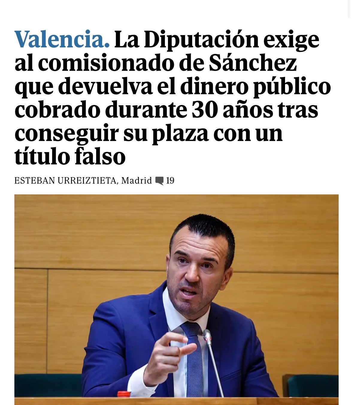 Dimite el comisionado del Gobierno para la DANA por la investigación sobre su plaza de funcionario, así leo en X la noticia en Público, el periódico comunista; Y también: el PP exigirá que devuelva todo lo cobrado irregularmente ¡bien! Aviso claro a navegantes.