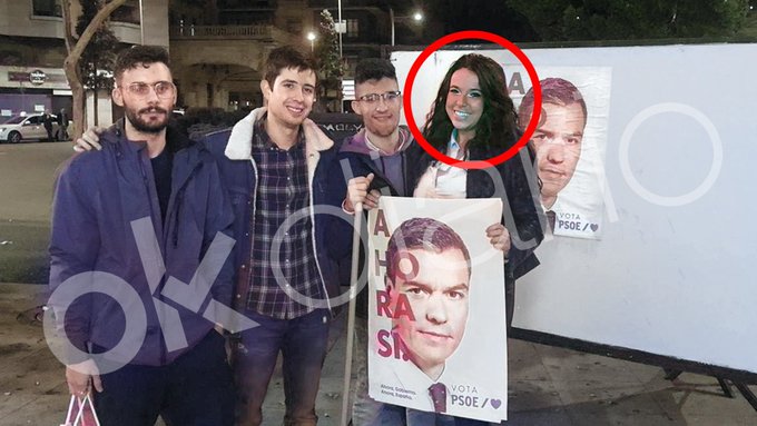 Sarah Santaolalla pegando carteles de Sánchez. Foto regalada por socialistas arrepentidos.