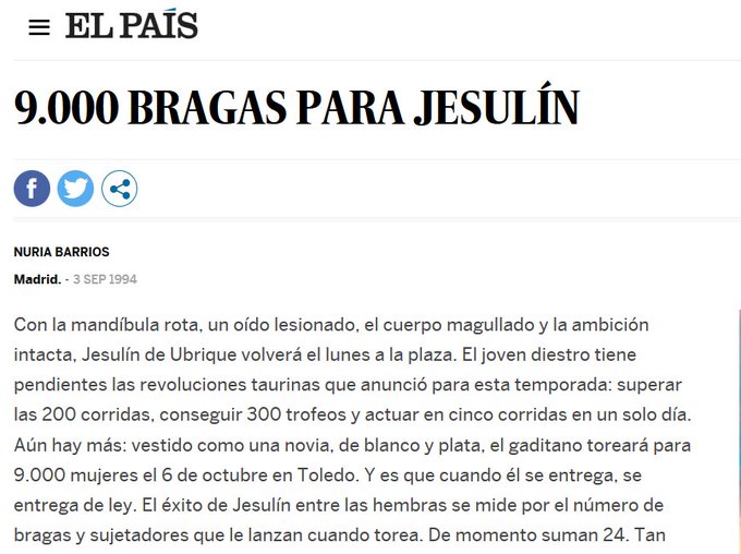 Fue hace treinta años, en 1995. Año de la Jesulínmanía. En ese año Begoña Gómez tenía veinte, y acaso asistiera a alguna de esas corridas si el horario de trabajo se lo permitiera. Algunas fuentes afirman que Sánchez conoció a la que fuera su esposa en la universidad Complutense. Otras lo niegan en rotundo, puesto que nunca asistió a la universidad la hija de Sabiniano. Volvamos a lo anterior. ¿Llenaría Sánchez un mitin solo para mujeres?