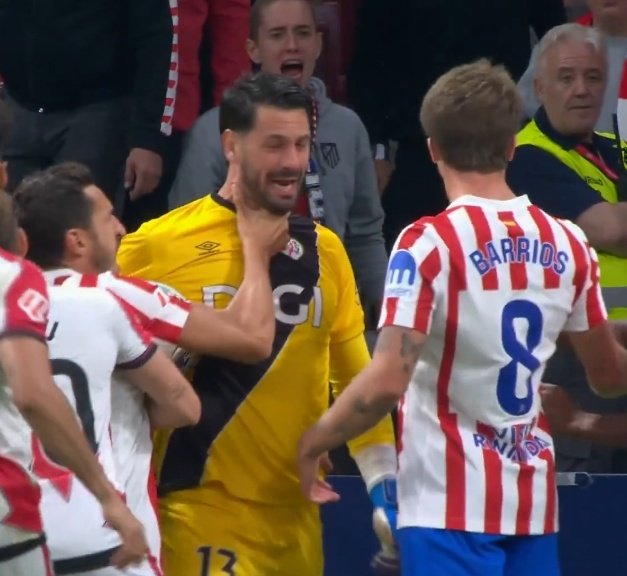 Aquí van las imágenes de Koke agarrando por el cuello a Batalla, el portero del Rayo Vallecano: lo vió todo el mundo, menos el VAR. La Liga, corrupta.