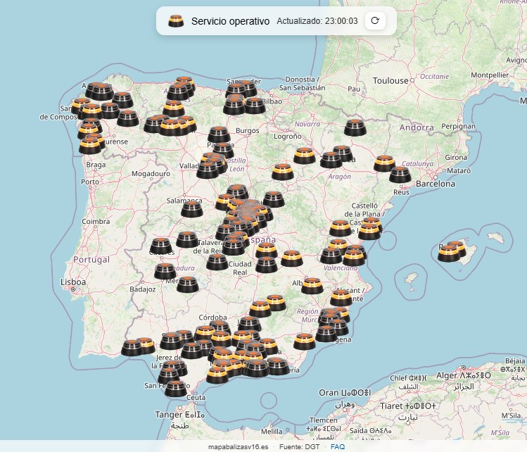 Este es el mapa de las balizav16 activas en este momento, la verdad tengo mis dudas. Pero si estoy averiado en le quinto coño y es una carretera perdida donde los guardias no irán, prefiero que eso lo sepa mi compañía de seguros y la grúa. Y nadie más.