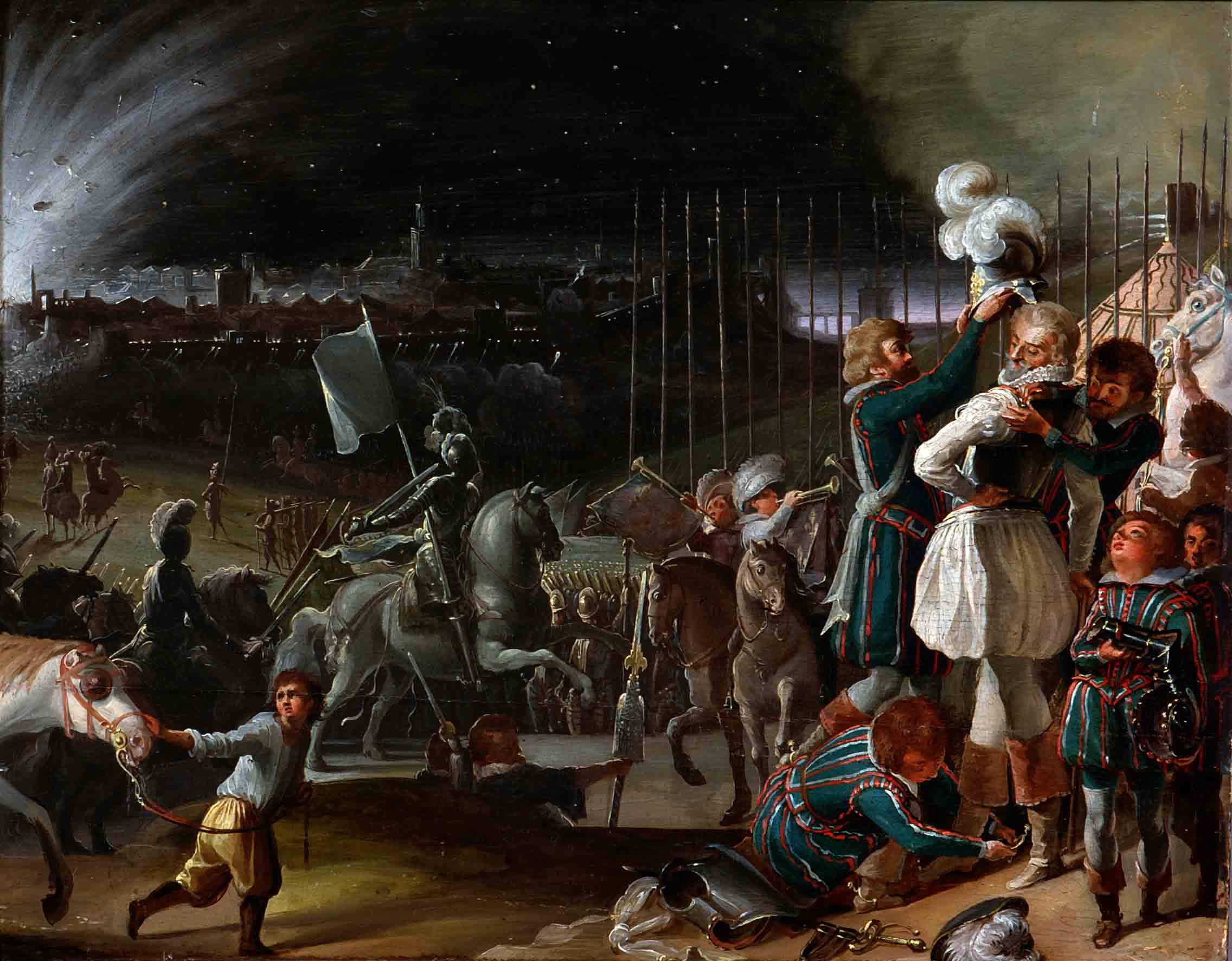 Cuadro que representa el sitio de París en 1590 por los hugonotes Enrique IV sitió la capital francesa después de varias victorias militares. Por falta de artillería, el rey entonces protestante Enrique IV prepararon el sitio de la capital de Francia para forzar su rendición por hambre. Sin embargo, la ayuda de Felipe II que formó un ejército interncional facilitó el triunfo de la Liga Católica. Enrique IV se convirtió al catolicismo y los protestantes franceses pudieron libremente aunque con ciertas limitaciones ejercer su culto bajo la autoridad de Enrique IV convertido al catolicismo. El edicto de Nantes puso fin a las guerras de religión en Francia.