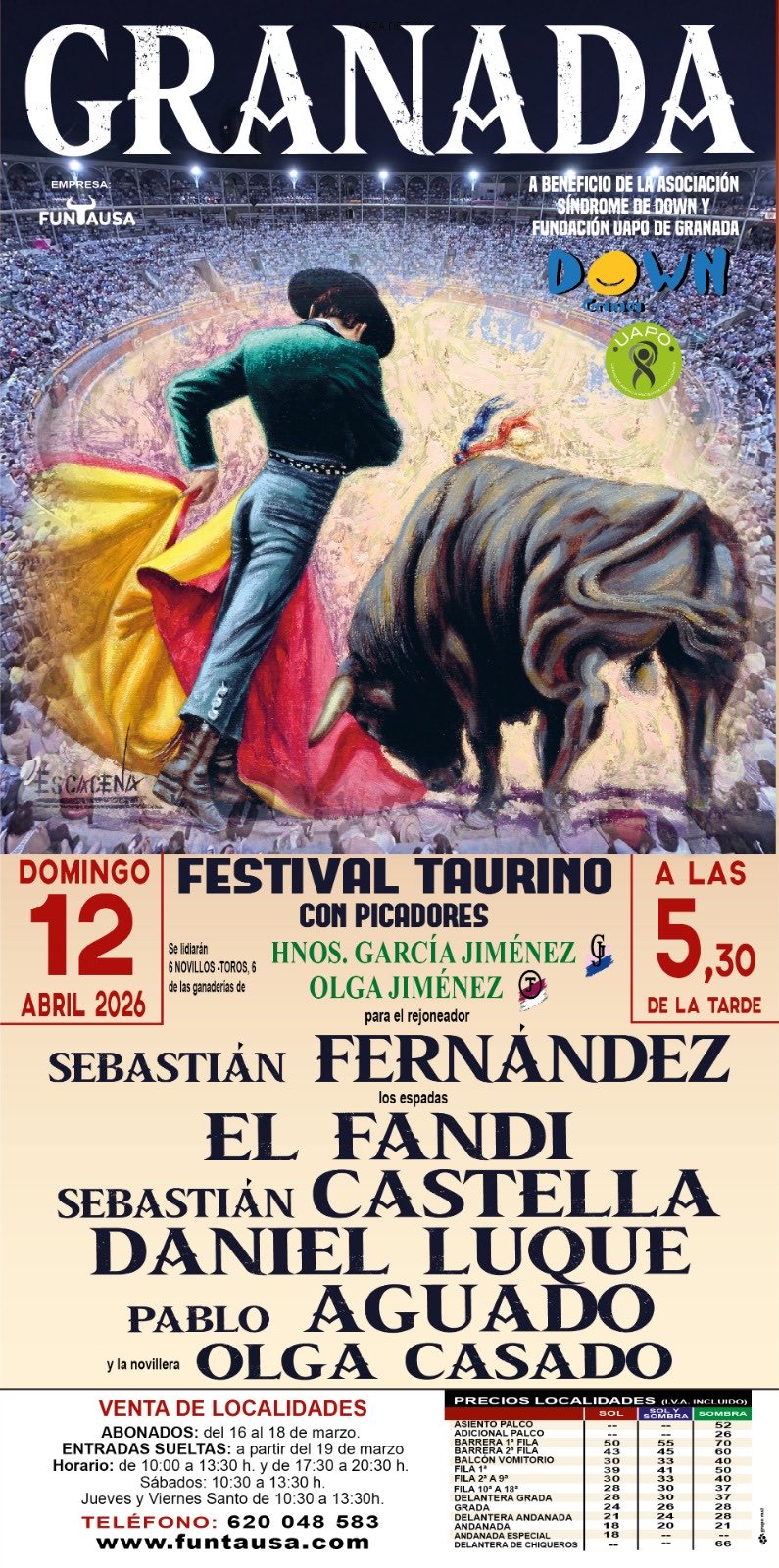 XII Festival Taurino a beneficio de la asociación Granadown se celebrará el domingo 12 de abril en la plaza de toros de Granada. Cartel: