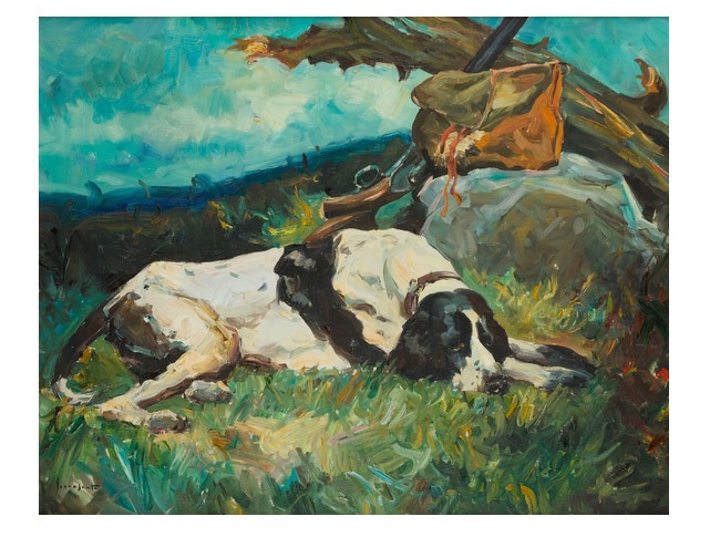 Aunque no fue un pintor taurino en sentido exclusivo, el lado animal y taurino sí forma parte de su repertorio. El mercado ha documentado obras como Torero, Bueyes, Perros de caza, Cazador, Escena de montaña con figuras y bueyes y Jauría atacando al jabalí. Ahí se ve con claridad que el animal no le interesaba como simple adorno, sino como masa, empuje, musculatura y tensión. El toro, el perro de caza o la yunta encajan de manera natural en su lenguaje: espátula viva, color corpóreo, dramatismo de la materia y una atención muy española a la relación entre el hombre, la tierra y la bestia. Más que un especialista del ruedo, fue un pintor al que la bravura y la fisicidad animal le venían de dentro de su propio sistema plástico.