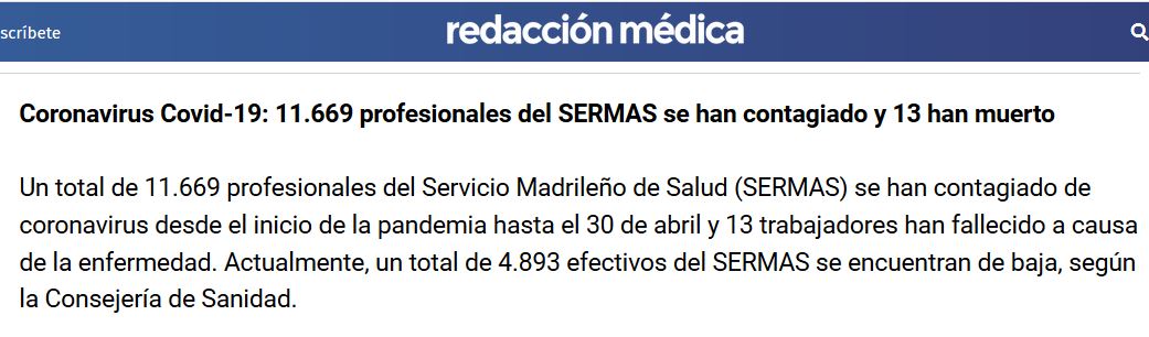 Tanto las cifras de sanitarios contagiados como las de sanitarios muertos son cifras insoportables que exigen un esclarecimiento total y exigen también establecer responsables de este caos. Y, por supuesto, los responsables no son los sanitarios. Son responsables quienes les enviaron al frente sin las debidas condiciones de protección.