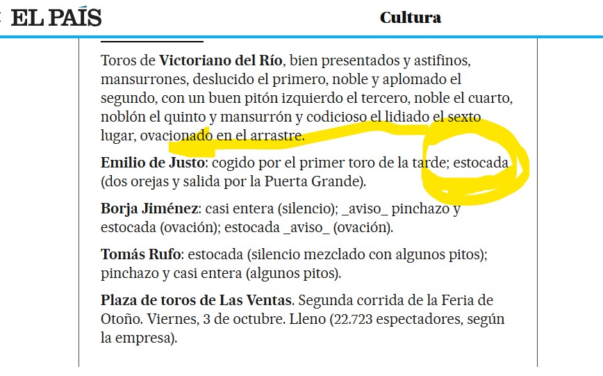 En El País dicen que de Justo mató de "estocada" al sexto y se ganó una merecidísima puerta grande.