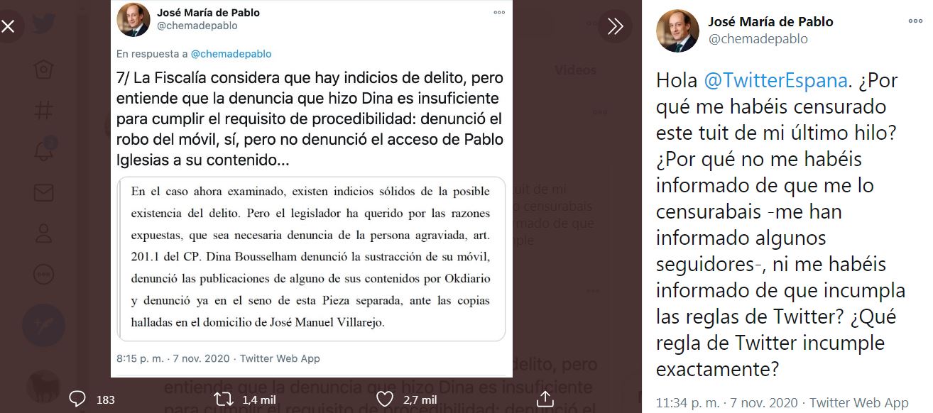 Este es un caso de censura de lo más singular. El autor es abogado, profesor y tertualiano en la radio de la Ser. Y un "bot" de tuiter le "capa" los hilos, le corta/censura sus intervenciones.