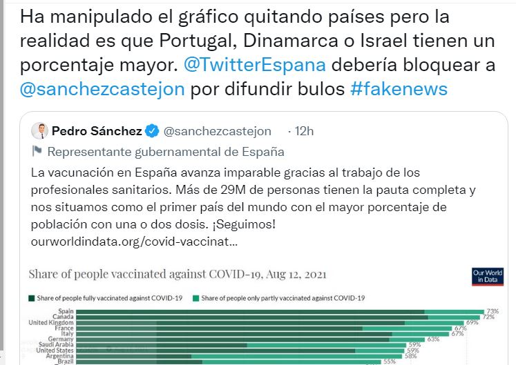 Las redes sociales censuran... a quien quieren. Mentir en las redes sociales sobre la pandemia, o difundir noticias falsas es motivo de sanción en twitter, por ejemplo. Excepto si quien miente es Pedro Sánchez, que engaña al público dando noticias falsas sobre vacunación.