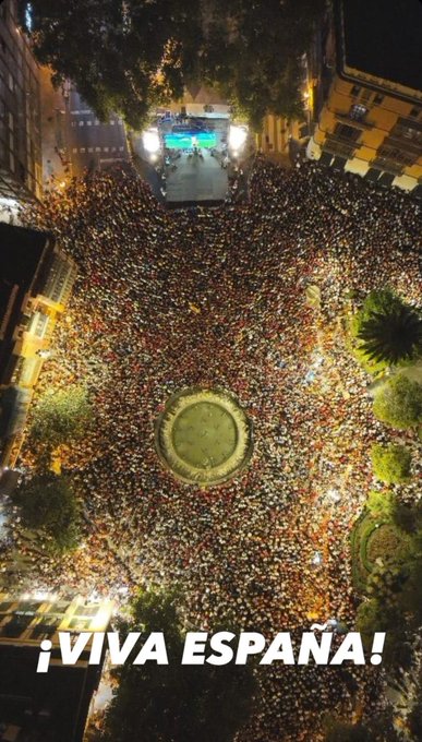 Mucha chiquillería celebrando el partido de la selección de España en Pamplona. Hay una extraña coincidencia de antiespañoles haciendo cosas ...y siguen siendo cosas sospechosas. Pero ahí están, miles de pamplonicas aplaudiendo a la Selección de España.