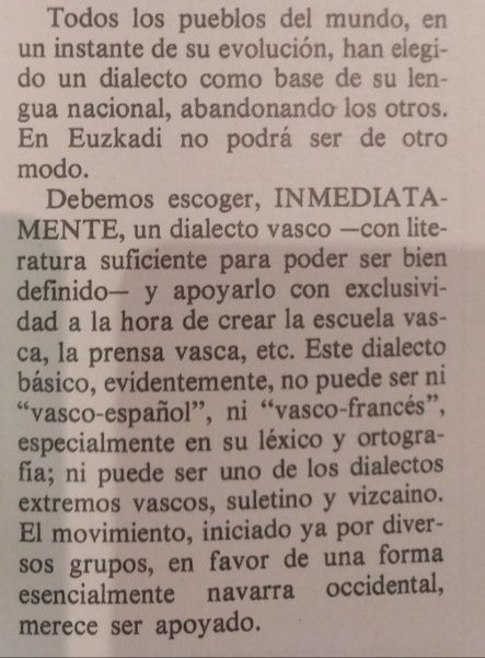 El "vasco" el "euskera" o eusquera es una creación absolutamente artificial escogida por un grupo minoritario que decidió borrar todos los dialectos o variantes para imponer una forma, única, y de obligado aprendizaje. Los "viejos" que hablan vasco como lengua materna no entienden el "batua".
