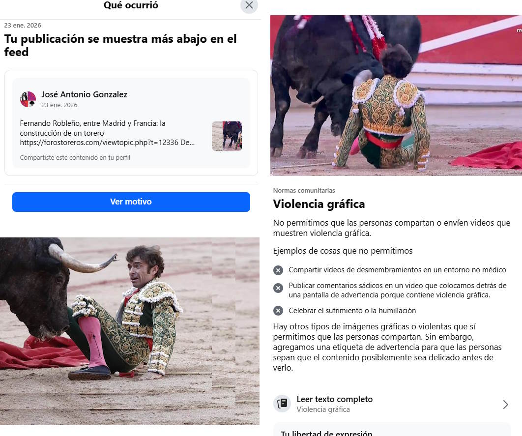 Esta ha sido la respuesta de facebook cuando he compartido un resumen del texto y las fotos, me pareció increíble, y lo que hice fue copiar y pegar la respuesta de facebook y añadir las fotografías que eran objeto de censura.