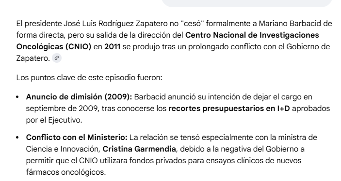 Mariano Barbacid fue el fundador y primer director del Centro Nacional de Investigaciones Oncológicas (CNIO) desde su creación en 1998 hasta 2011. Él mismo anunció en 2009 su intención de dejar el cargo para centrarse en su investigación (específicamente en tumores con mutaciones KRAS), y permaneció en funciones hasta que -durante el gobierno de Zapatero- fue sustituido formalmente en junio de 2011 por María Blasco. (María Blasco fue destituida como directora científica del CNIO el 29 de enero de 2025 por el patronato, poniendo fin a 14 años de gestión tras acusaciones de acoso laboral, abuso de poder y mala gestión).