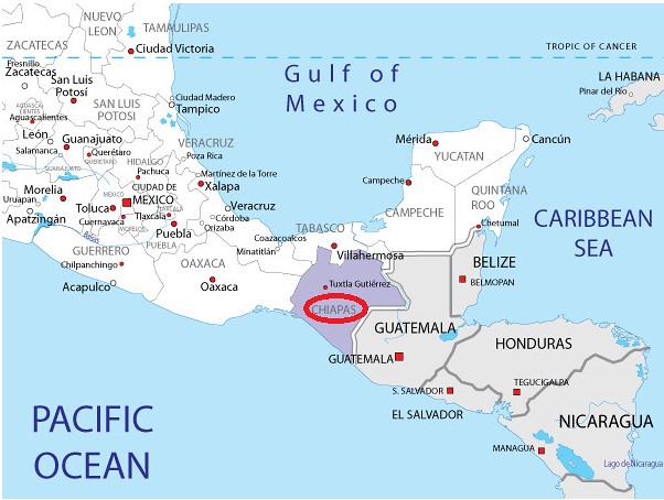 El estado de Chiapas es uno de los 32 que conforman México, y es el estado más al sur de México. Con 73,311 kilómetros cuadrados de extensión y una población de 5.7 millones de habitantes. Chiapas tiene frontera con Guatemala (unos 654 kilómetros); limita al norte con el estado de Tabasco, al noroeste con Veracruz, al oeste con Oaxaca y al suroeste con el océano Pacífico, donde cuenta con una costa de más de 250 kilómetros. Su relieve es variado, con altas montañas como la Sierra Madre de Chiapas, selvas tropicales como la Lacandona y planicies costeras, lo que lo hace un territorio rico en biodiversidad. La huella española en Chiapas se remonta a la llegada de los españoles en el siglo XVI, cuando Hernán Cortés envió expediciones en 1522 para someter a las poblaciones indígenas, como los mayas, zoques y chiapanecas, culminando en la fundación de importantes asentamientos desde 1528.