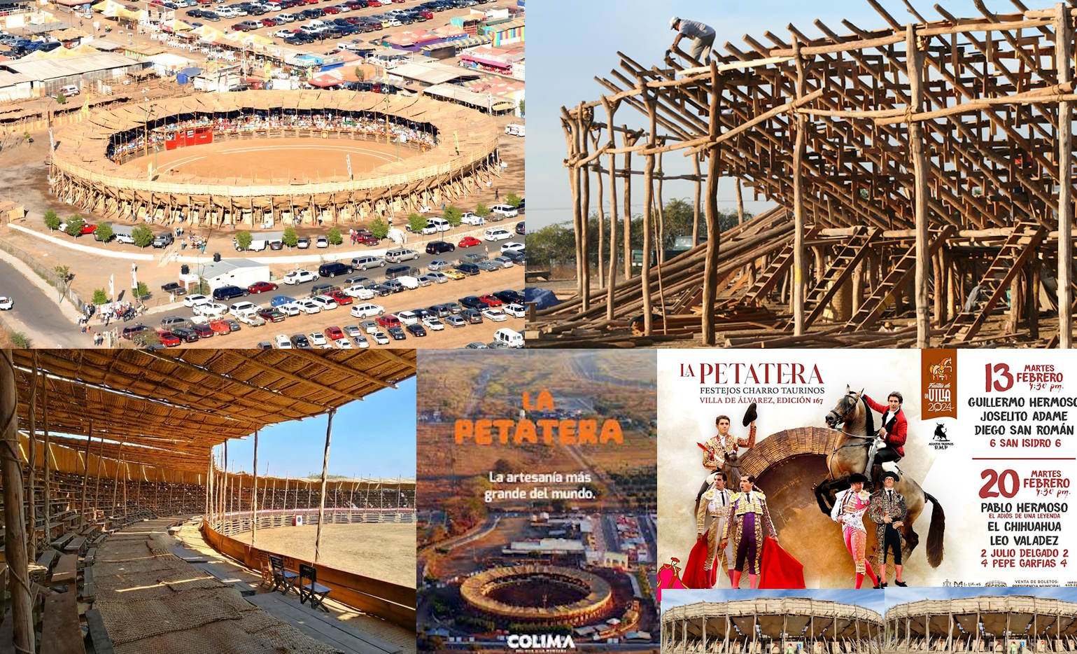 Colima, capital del estado homónimo, vista aérea En el ámbito taurino, Colima ha tenido históricamente un perfil más popular que de gran circuito nacional. El símbolo más singular es la Plaza de Toros “La Petatera”, en Villa de Álvarez: un coso artesanal y desmontable que se construye cada año (generalmente en febrero, para las Fiestas Charrotaurinas en honor a San Felipe de Jesús) con madera, sogas, clavos y petates de tule. La Petatera es Patrimonio Cultural Inmaterial del Estado de Colima desde julio de 2013, además de ser reconocida como Monumento Artístico de la Nación, parte del inventario del patrimonio cultural inmaterial de México y considerada la artesanía más grande del mundo por su construcción colectiva anual. Es por derecho propio la plaza de bandera de este estado y de su capital, Villa Álvarez está en la zona conurbana de Colima.