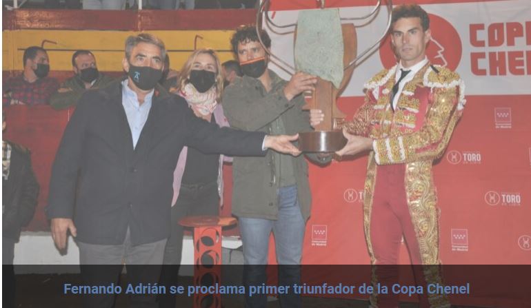 El vencedor de la Copa Chenel ha sido un torero que en mucho tiempo solo ha toreado dos tardes y la final: Fernando Adrián. Y esto es un éxito, porque la copa Chenel quería dar oportunidades a los que menos torean. Qué me decís?