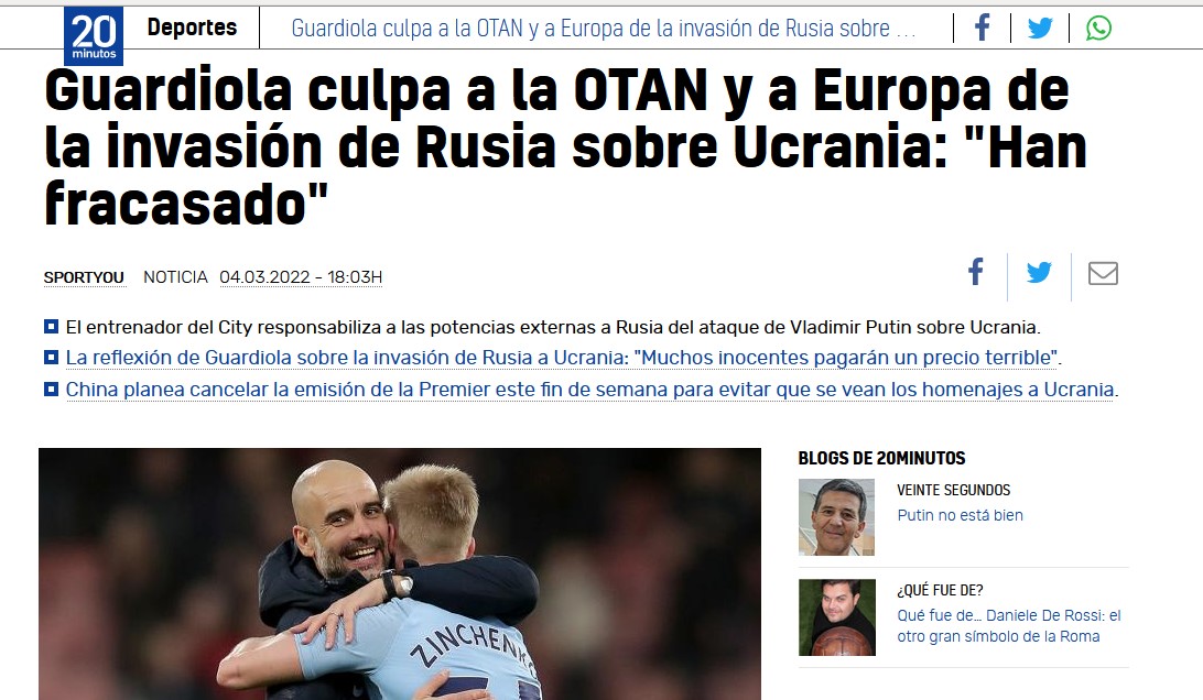 Pues Guardiola, Pep, el entrenador del Manchester City se alinea con las posiciones de Putin, y el catalán declara culpables de la invasión a la OTAN y a los países europeos.