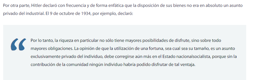 Hitler se manifiesta contra la propiedad privada en repetidas, múltiples ocasiones. Nunca "tumba" la propiedad privada mientras sirva a sus intereses. Pero queda absolutamente sometida, la agricultura, la industria en todas sus ramas, y el capital también, queda sometido al dictado de las necesidad, órdenes o exigencias del "Reich", del partido o de la persona de Hitler.