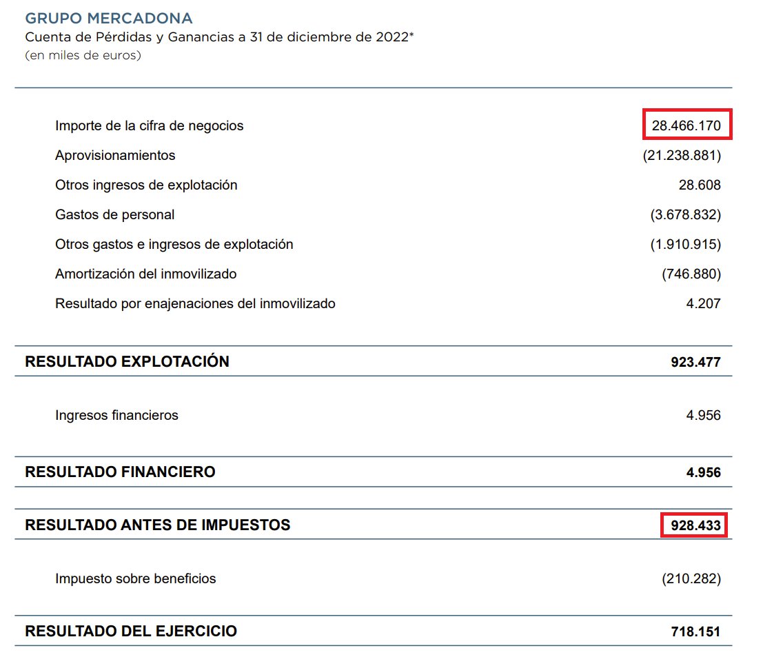 Margen de beneficio neto de Mercadona en 2022: 3,2 céntimos por cada euro de ventas (antes de impuestos: después de impuestos, 2,5 céntimos).