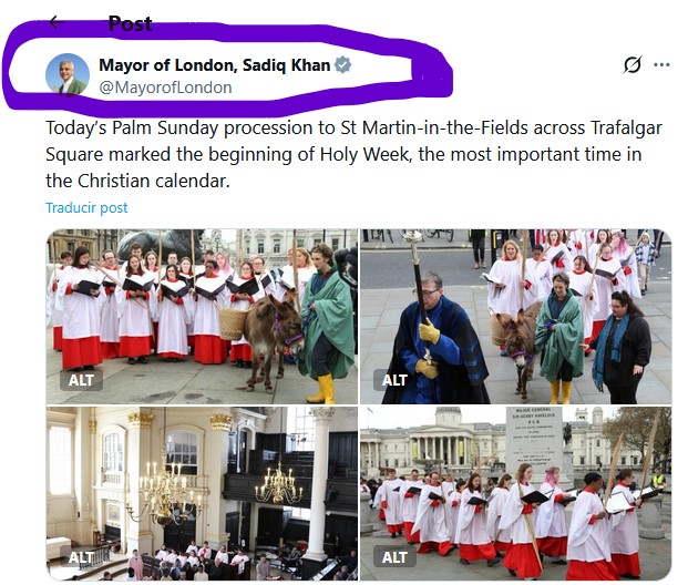 Y empiezo subiendo unas imágenes que ha compartido el alcade de Londres, de religión mahometana, Sadiq Kan, para conmemorar el "Domingo de Ramos por Trafalgar Square, que marca el comienzo del tiempo más importante del calendario cristiano"
