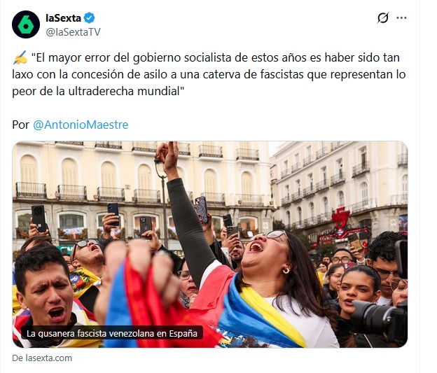 El búnquer se cabrea, y aquí uno de los más acérrimos del búnquer y del inmovilismo en Venezuela, Antonio Maestre en uno de sus altavoces, La Sexta: de vergüenza llamar fascistas a todos los que están en contra del dictador Maduro