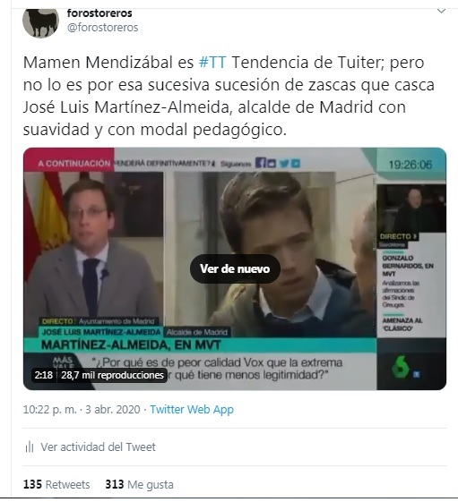 En el tuit el alcalde de Madrid esquiva el golpe de una pregunta retorcida y cargada de veneno con una finta verbal y una respuesta prolongada y sostenida en interés, argumentación y lógica; resulta apabullante, y la periodista que jugaba con ventaja lanzando una pregunta, además con veneno, tuvo que retirarse descolocada, y dolida, eso sí.