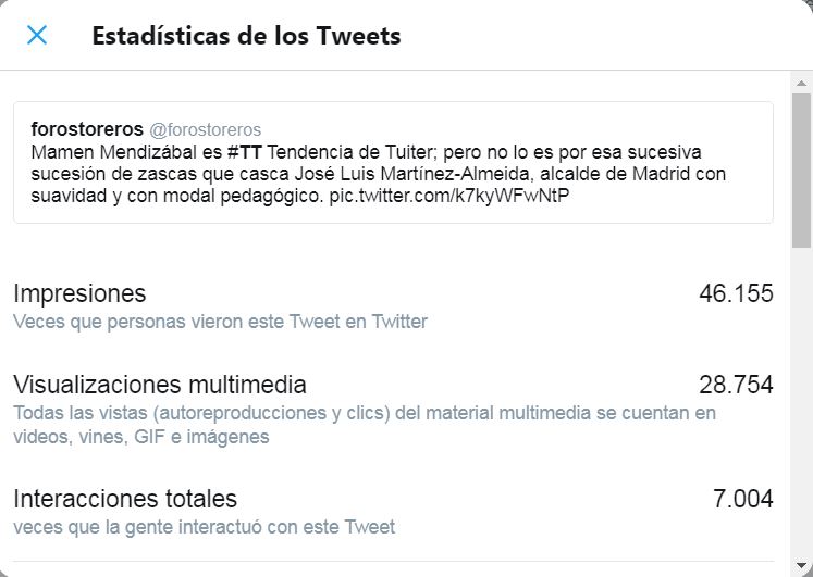 Aqui véis la actividad del tuit tomada el sábado por la tarde. Más de 46.000 impresiones y más de 28.000 visualizaciones.