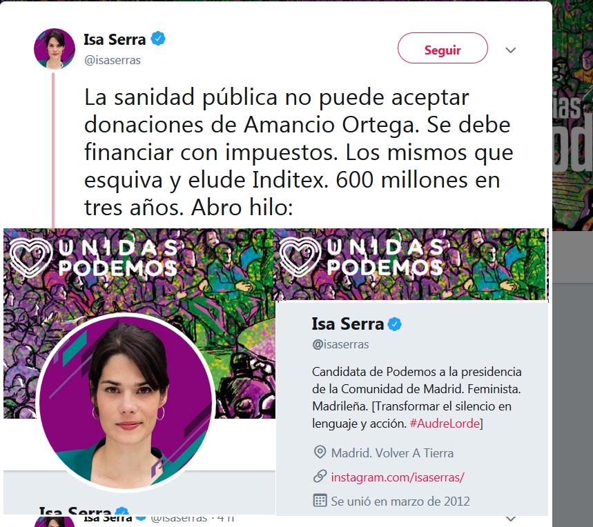 Antes de seguir, vamos a aprovechar esta tendencia en twitter con la candidata de Podemos Madrid que rechaza los equipos donados por Amancio Ortega para luchar contra el cáncer.