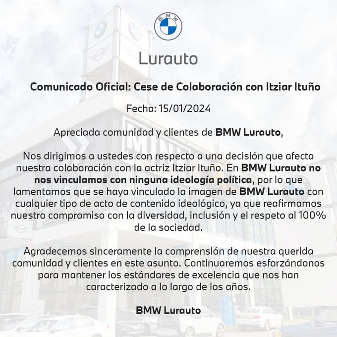 No han resistido ni media hora como tendencia de tuiter, los "vascos" de Lurauto han lanzado un comunicado-bomba en el que renuncian a seguir colaborando con la actriz próxima a ETA. Se han tragado su propia mierda los de bmwespana y los de Lurauto