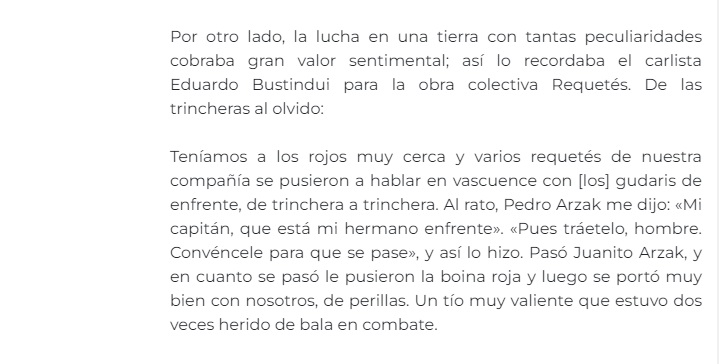 Teníamos a los rojos muy cerca y varios requetés de nuestra compañía se pusieron a hablar en vascuence con [los] gudaris de enfrente, de trinchera a trinchera. Al rato, Pedro Arzak me dijo: «Mi capitán, que está mi hermano enfrente». «Pues tráetelo, hombre. Convéncele para que se pase», y así lo hizo. Pasó Juanito Arzak, y en cuanto se pasó le pusieron la boina roja y luego se portó muy bien con nosotros, de perillas. Un tío muy valiente que estuvo dos veces herido de bala en combate.