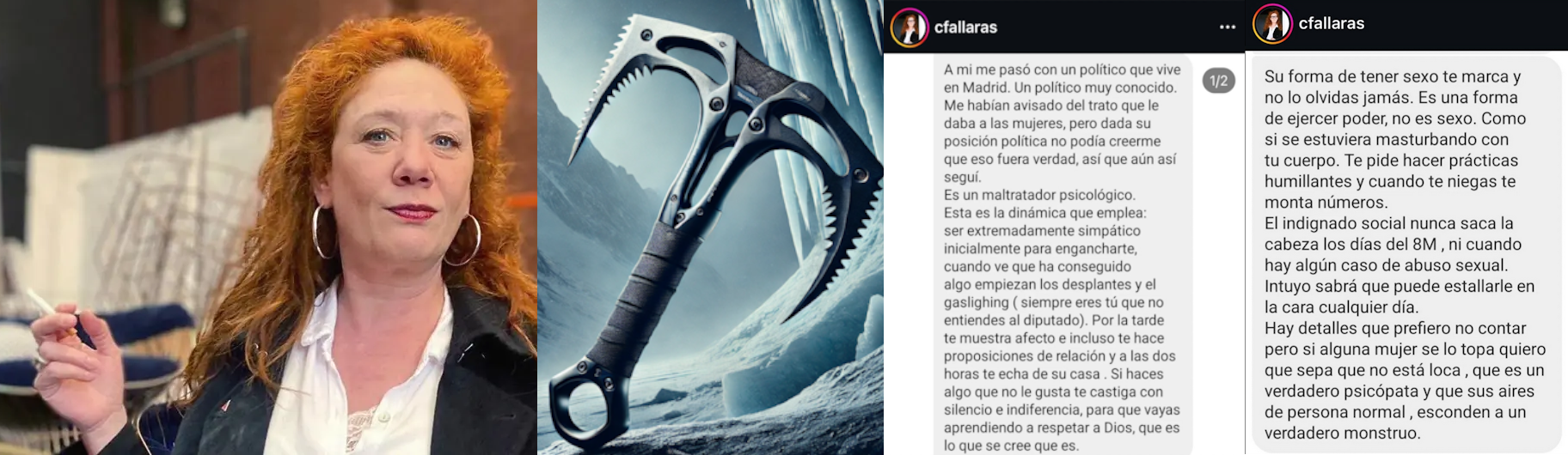 "Me habían avisado del trato que le daba a las mujeres" en esta frase además del golpe de piolet, pone el veneno la periodista... porque ahí encontrará munición suficiente para rematar a los caídos y a todo aquel (o aquella, atención) que deba ser sacrificado para demostrar el poder del nuevo amo y señor.