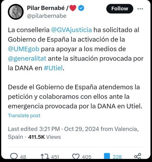 El primero, es obra de la delegada del Gobierno en Valencia, Pilar Bernabé García, socialista de largo recorrido como concejala en Valencia, etc. En su posteo, atención, reconoce que Mazón pidió la activación de la UME y ella, la delegada del Gobierno, trasladó la petición debidamente a las 15.21 del 20 de octubre. Aquí tenéis el posteo de la delegada del Gobierno.