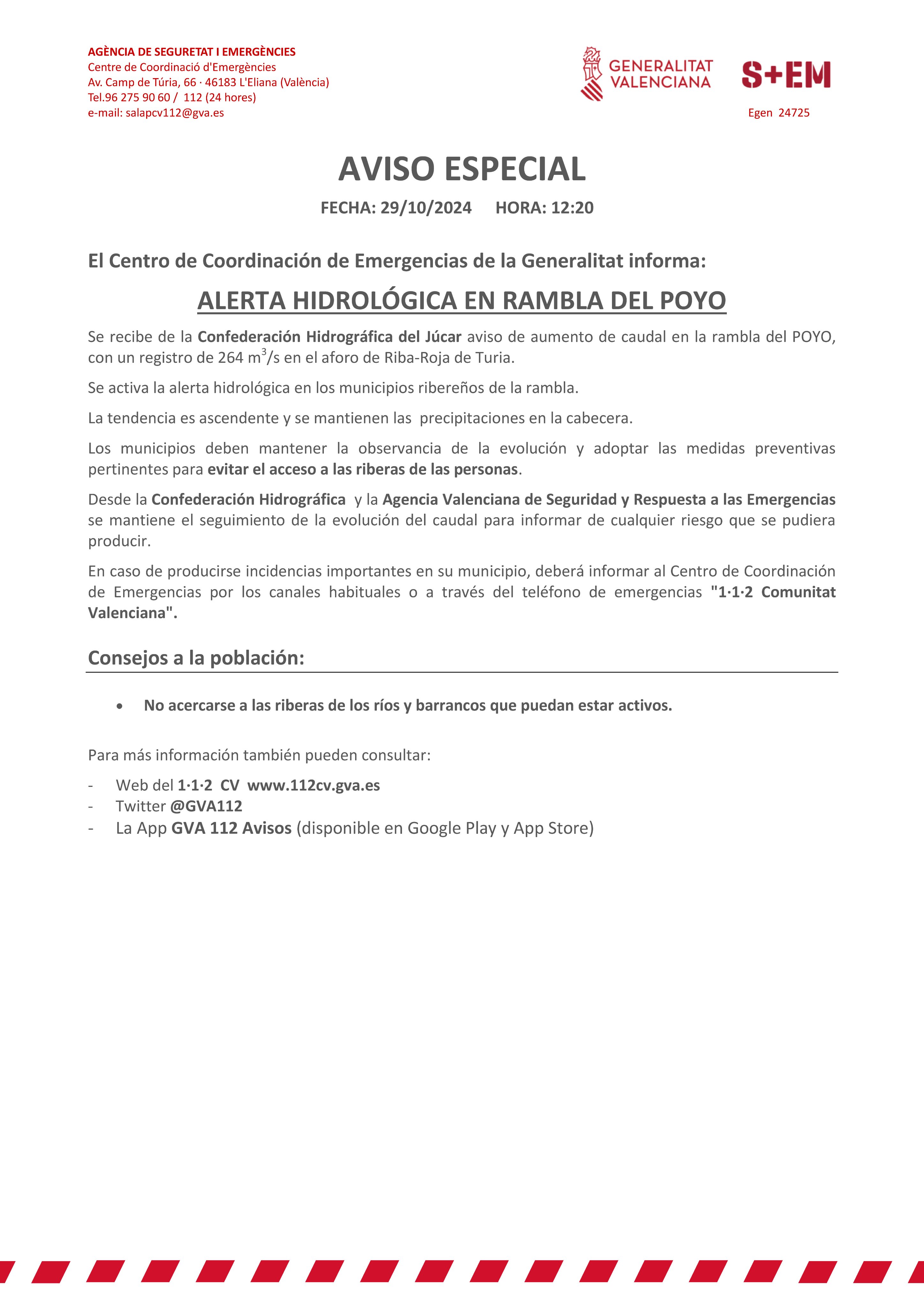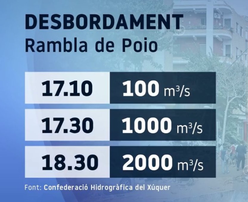 La Confederación Hidrográfica del Júcar solo avisó a la Generalitat Valenciana del riesgo de desborde de barrancos a las 18:49, y por email, casi a las 19.00 horas: muy tarde, y con las riadas que arrasarían con todo ya formadas.