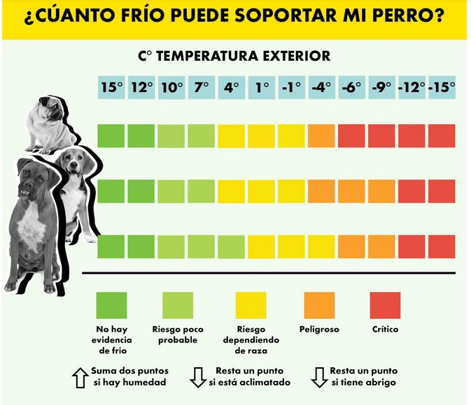 La prestigiosa Facultad de Veterinaria de Tufts, en Boston (Estados Unidos) desarrolló una escala objetiva para valorar el riesgo por frío en perros. Según sus criterios científicos, validados por profesionales, la mayoría de perros sanos no necesita protección térmica mientras la temperatura esté por encima de los 7 °centígrados. En ciudades españolas, esto ocurre durante la mayor parte del año. Tabla de calor soportable para perros según su tamaño y graduación del frío