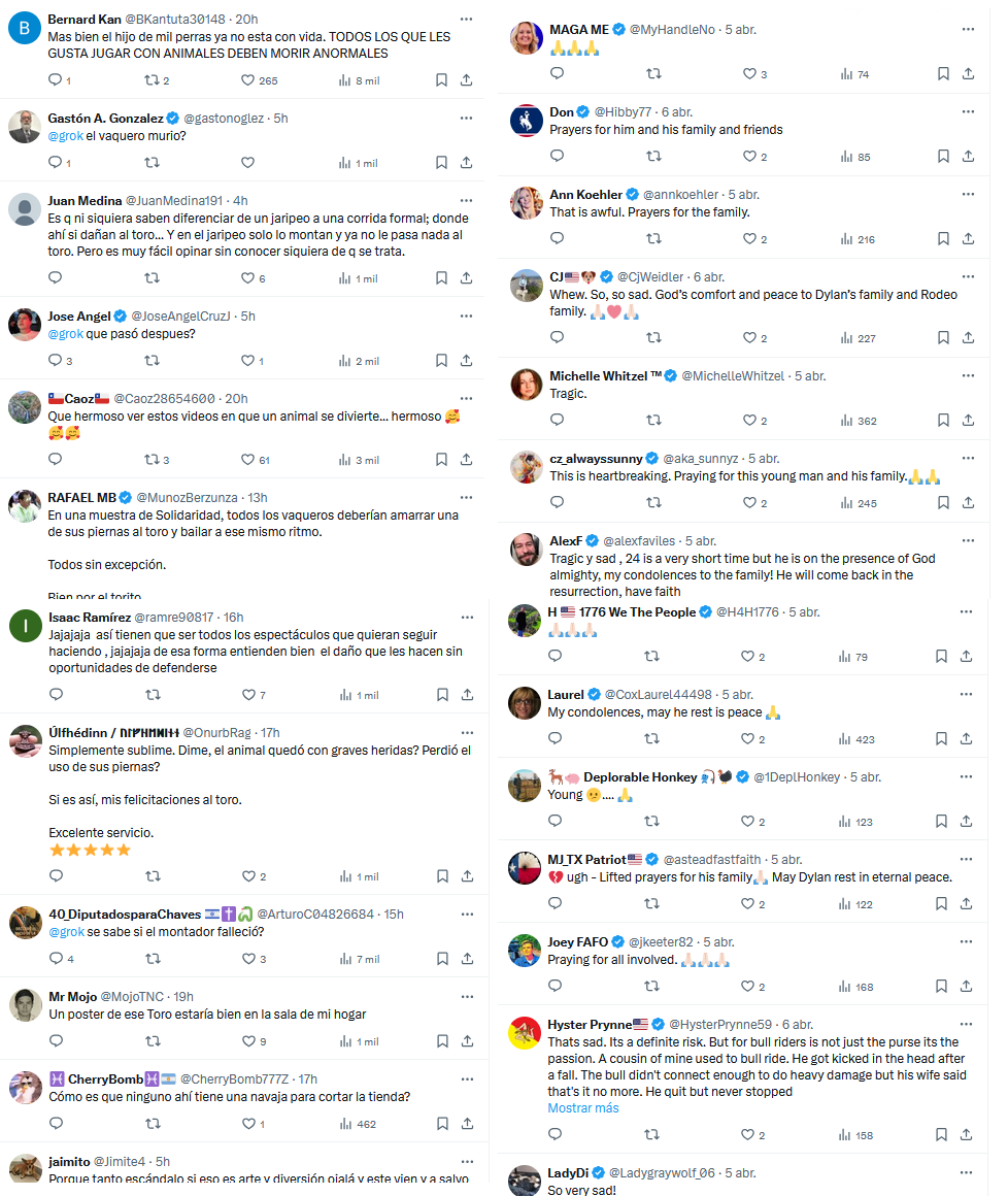 En contraste, las respuestas en inglés fueron prácticamente unánimes en la compasión. No se discutió el rodeo ni los animales. Se lloró al hombre. Tal vez ahí se cifra la diferencia más brutal: no en cómo se trata a los animales, sino en cómo se reacciona cuando muere un ser humano.