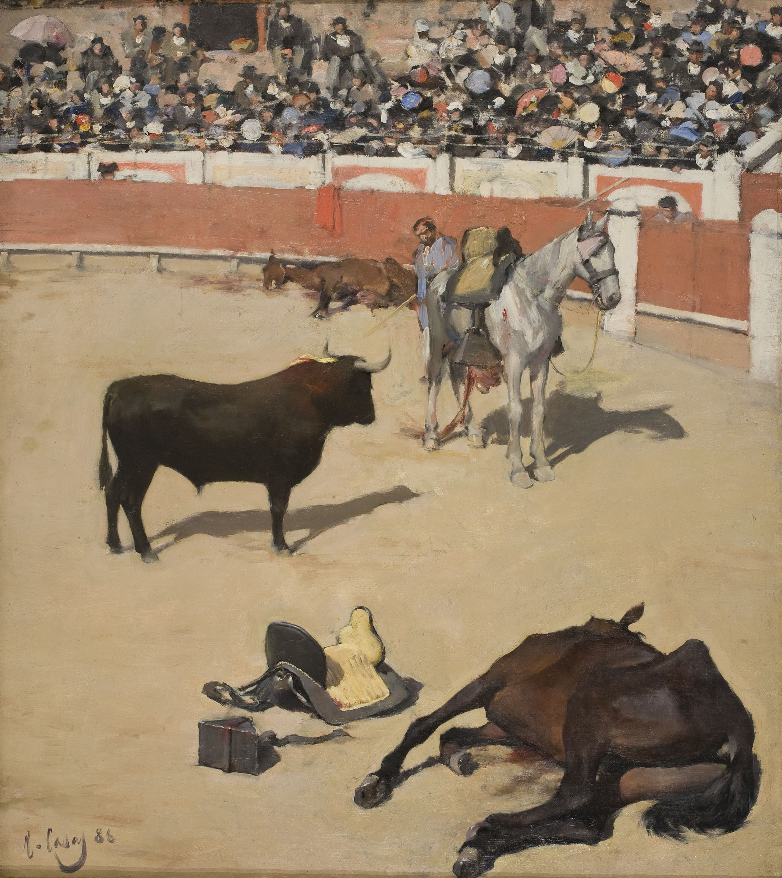 En obras tempranas como Corrida de toros o Toros (Caballos muertos), pintadas en la década de 1880, el foco no está tanto en el héroe individual como en el conjunto. El ruedo aparece como escenario de fuerzas contrapuestas: el animal, los caballos, el público, el calor, el polvo. Casas capta la atmósfera de la corrida con una mirada moderna, casi analítica, heredera tanto de la pintura española como de las lecciones aprendidas en París.