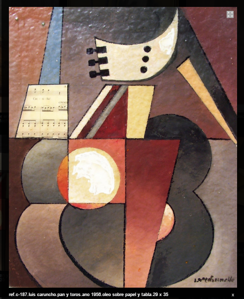 La relación de Luis Caruncho con la tauromaquia fue real, pero claramente secundaria dentro de su trayectoria. La obra más significativa en este ámbito es Pan y toros (1956), un óleo sobre papel y tabla realizado cuando contaba veintisiete años. Se trata de una pieza temprana, aún ligada a un lenguaje figurativo de raíz neocubista, anterior a la consolidación de su abstracción geométrica. El título remite a la conocida expresión española y sugiere una lectura simbólica y crítica más que una escena de lidia propiamente dicha.