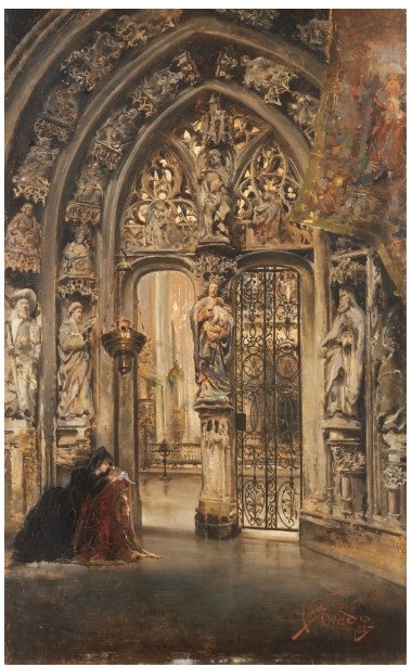 Entre sus piezas más destacadas está "Corrida en la Plaza de Toros de Oviedo" (c. 1890), donde la atmósfera festiva se mezcla con la vibrante tensión del enfrentamiento entre hombre y toro. Al contemplarla, uno casi puede escuchar los vítores y oler el polvo del albero, un eco de la Asturias de antaño que Uría amaba. En "El paseo de las cuadrillas" (1895), captura el instante inicial de la corrida, cuando los toreros desfilan con gallardía bajo el sol: la luz danza sobre sus trajes de luces, y el espectador se siente parte de esa procesión solemne, un ritual que trasciende el tiempo.